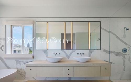 在室內(nèi)浴室的中間掛上一幅背景墻,深紅色的圖案和浴室柜的圖案進行了完美搭配。真正是土豪的做法。另外,在一款浴室背景墻上設計的,是整面墻都有的石材背景墻,白色中不經(jīng)意的底色,配以白色浴室柜,給整個浴室?guī)砹藷o限生機。