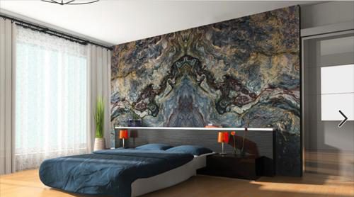這個設計是將天然渾成圖案直接用在臥房當背景墻。比起一些高不高、低不低的床頭,顯然這樣的設計大氣多了。同時,整個墻面給人一種回歸宇宙空間的感覺。