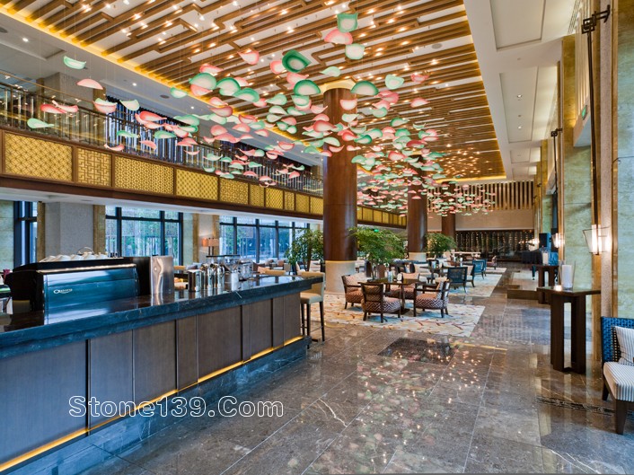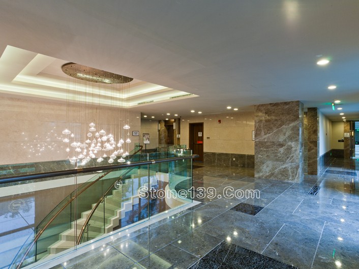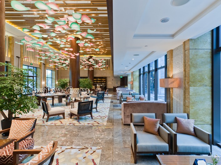 不過今天主要討論的是該酒店的石材裝飾部分。該石材工程主材為伊利諾灰、意大利木紋,主要加工部位為大堂、宴會廳及走廊燈,含雕刻、拼花、線條燈多種產品類型。下面就一同來欣賞吧。