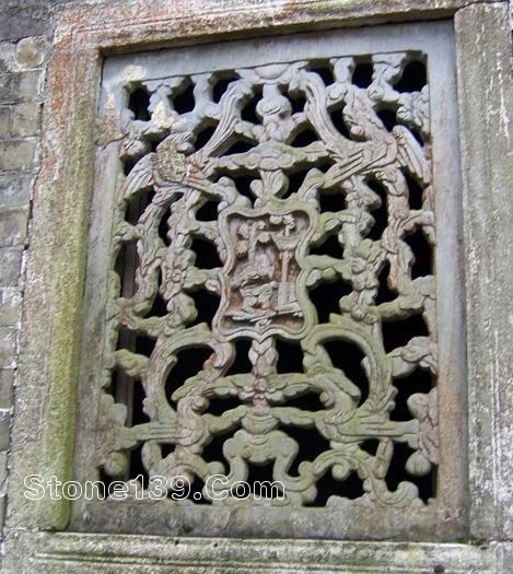 首先,從中間的“福”字講起吧。這石窗“福”字四周有四只蝙蝠,蝙蝠間還鑲有祥云。古時蝠喻為福。《抱樸子》說:“千歲蝙蝠,色如白雪,集則倒懸,腦重故也。此物得而陰干末服之,令人壽萬歲”。蝙蝠在中國傳統文化中象征“福氣”。民間繪畫中常畫五只蝙蝠,意為《五福臨門》。這圖則含“福從天降”之意。