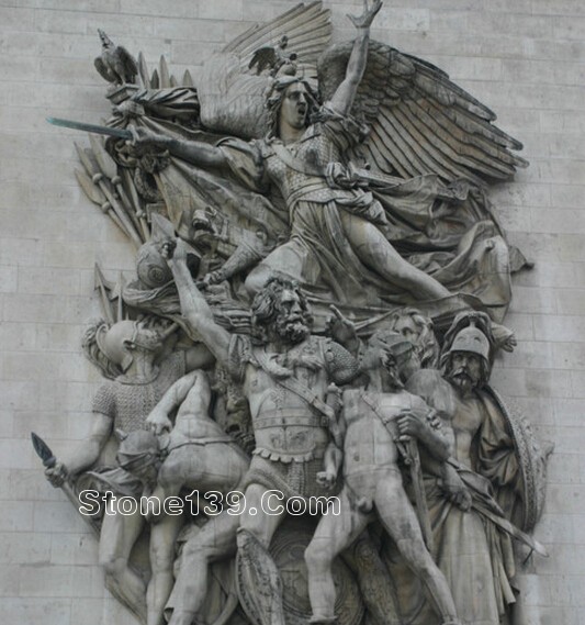 法國巴黎戴高樂廣場凱旋門上的著名建筑浮雕《1792年的出發》,是高浮雕的杰作。藝術家將圓雕與浮雕的處理手法加以成功的結合,充分地表現出人物相互疊錯、起伏變化的復雜層次關系,給人以強烈的、撲面而來的視覺沖擊感。 淺浮雕起位較低,形體壓縮較大,平面感較強,更大程度地接近于繪畫形式。它主要不是靠實體性空間來營造空間效果,而更多地利用繪畫的描繪手法或透視、錯覺等處理方式來造成較抽象的壓縮空間,這有利于加強浮雕的整體美感和視覺沖擊力。