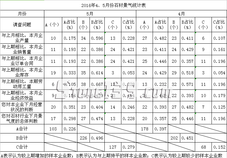 通過對產量、銷量、訂單、庫存、勞動用工、經濟效益等幾項主要指標與上月對比及對下月景氣預測等進行市場調查,對主觀判斷結果進行統計得出,5月份石材景氣指數收報于96.61點,環比回落18.49點,回落約16.07%,與去年同期相比下降5.39點,下降約5.28%。5月份景氣指數下降至100點以下,明顯回落。