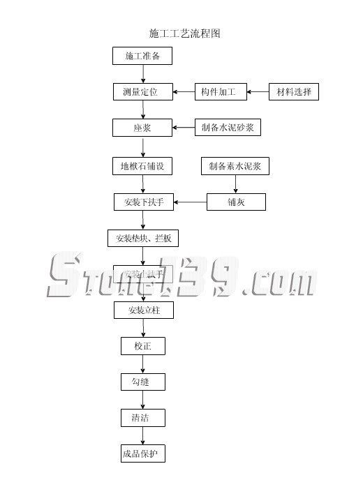 材料選擇→構(gòu)件加工→安裝地袱石→安裝下扶手→安裝下墊塊→安裝攔板→安裝上墊塊→安裝上扶手→安裝立柱→勾縫→棱角打磨→清洗。
