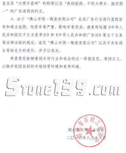 8月26日,湖北省石材工業協會正式向國家工商總局及中央電視臺提交投訴函,舉報佛山市簡一陶瓷公司(以下簡稱“簡一”)目前投放的產品廣告存在嚴重的虛假宣傳和商業詆毀問題,希望相關部門予以制止,并責令整改,全文如下: