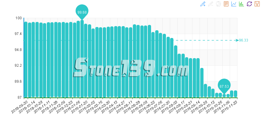 據“中國·水頭石材指數”系統監測,20161123期石材周價格指數收報于95.88點,環比下調0.08點,下調0.09%。本周石材價格波動下調,其中花崗石及其他石材類價格環比均持平,大理石價格小幅回落,合成大理石類價格則繼續上調。本周大部分石材品種價格仍較穩定,部分大板價格隨市場行情波動調整,少數大理石庫存舊板有瑕疵,因而降價幅度較大。
