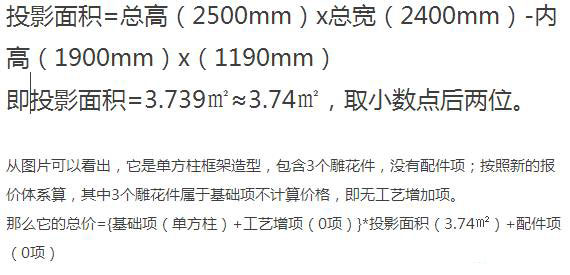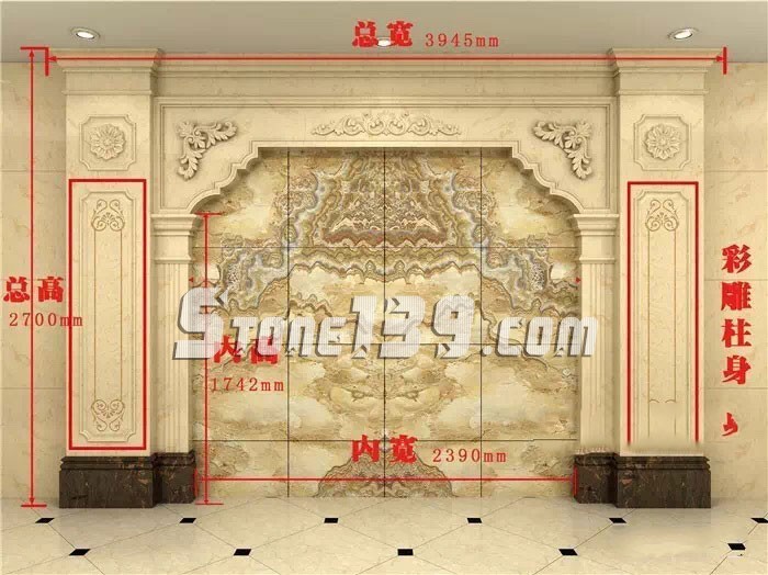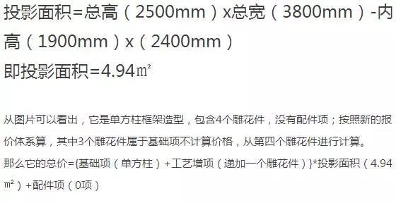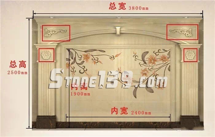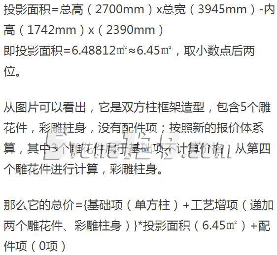 在基礎項當中,整體背景墻的投影面積不足3.5㎡的按照3.5㎡算;帶彎線的門頭板高度按最低點計算;方柱門洞面積按展開面積算,即包括內、外、側三面。工藝增項的雕花件3個以內的算基礎項,從第四個起每個雕花件遞加80元/㎡,以此類推。