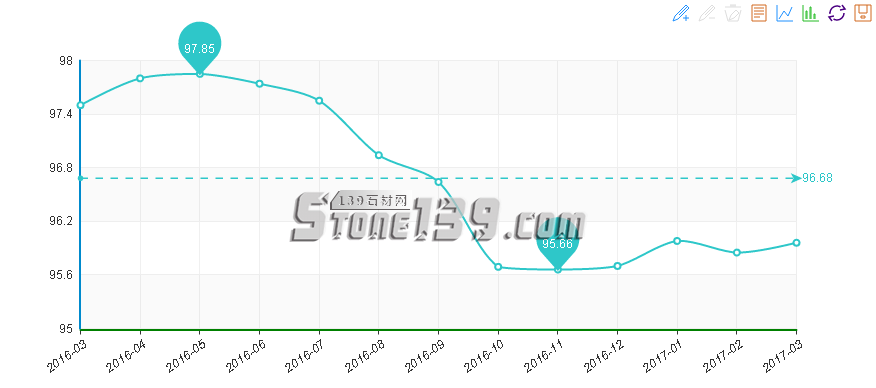 大理石類本月價格指數收報于96.66點,較2月份上調0.17點,上調約0.17%,月價格同比指數為99.92點,與去年同期相比有所下降。本月大理石價格指數波動回升、周價格呈現波動調整的態勢。大板、成品及荒料月價格均小幅推升。本月在展會利好效應下,市場行情有所升溫,所有大理石品類價格略有上調,特別是質量等級較高、材質較好的品種,價格明顯上調,但也有少部分舊庫存降價處理。總的來說本月大理石價格呈微幅回升的趨勢。
