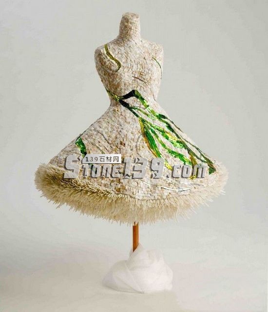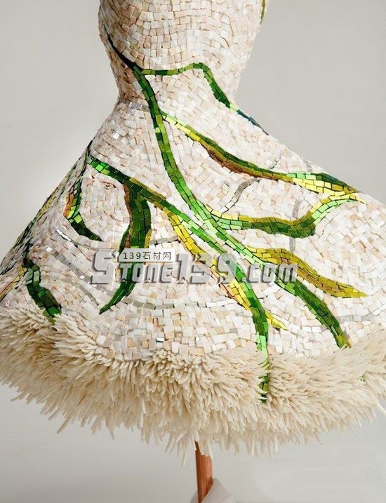 這條白色飾有綠色花紋的禮裙由大理石、玻璃馬賽克、鍍金馬賽克、玉髓及貝殼制作而成,講述了一個關(guān)于發(fā)生在墨西哥灣的美好事物消逝的故事,蔓延在裙子上的亞洲綠海帶實際上是一種墨西哥灣的入侵物種,它們對貝殼的生存環(huán)境造成了極大的影響。