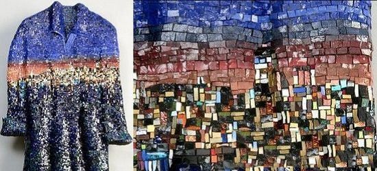 另一條以藍(lán)綠色為主色調(diào)的長衫,則是藝術(shù)家試圖表現(xiàn)某一次開車到海灣對面的公園景點,身處寧靜海灣遠(yuǎn)眺對面人潮洶涌的舊金山城的感受,那份安寧與喧囂的巨大反差給了藝術(shù)家難忘的心靈震撼。