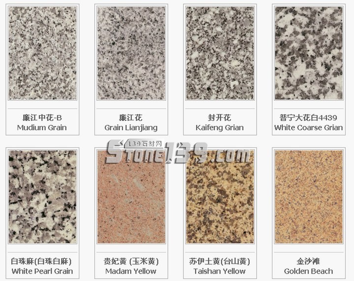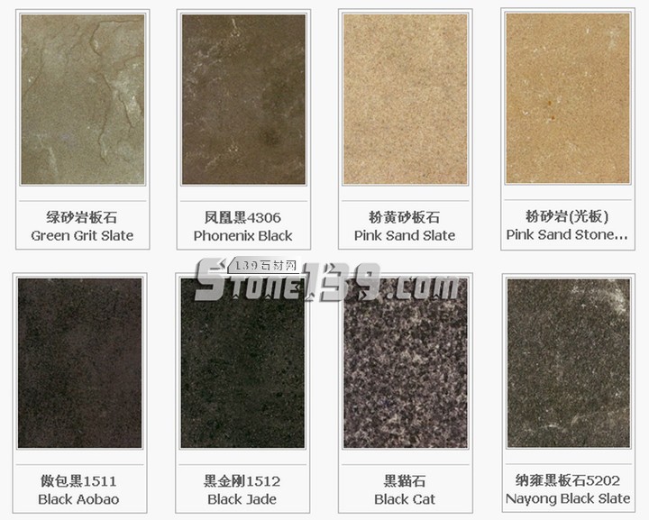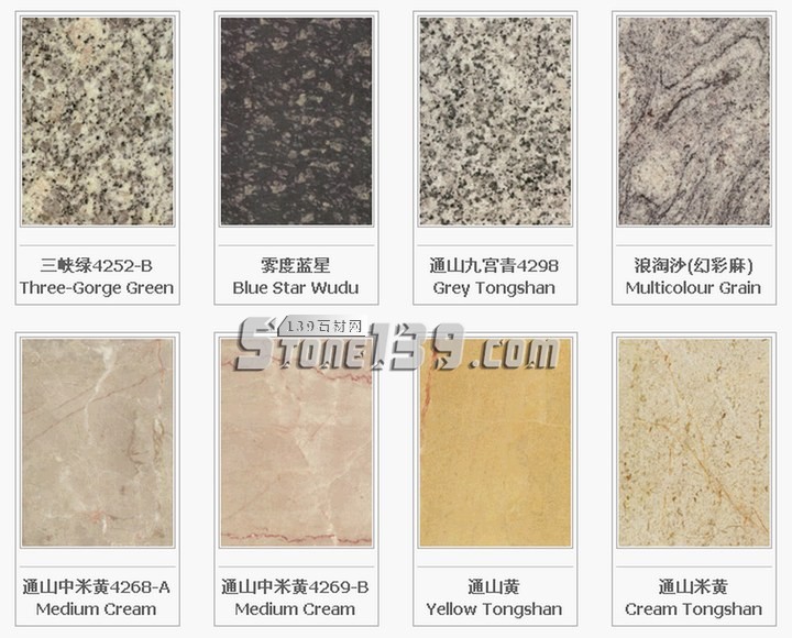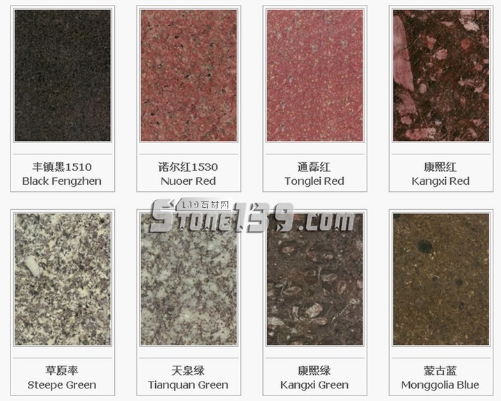 山西地區:北岳黑G1401;代縣金夢G1407;蝶彩綠G1409;翡翠藍B1411;富貴紅M1421;廣靈象牙黃 G1404;黑麻點 G1415;恒山青G1403;金沙黑-中點G1417;靈丘山杏花G1406;隨州綠G1410;夜玫瑰G1412;玉鉆麻G1408;