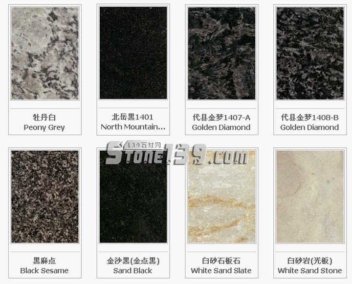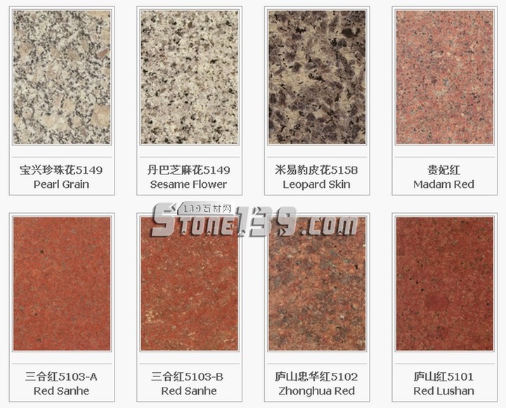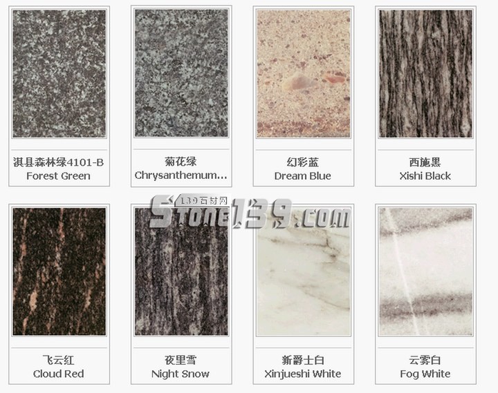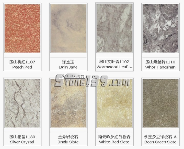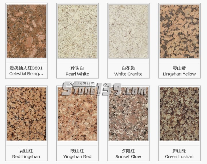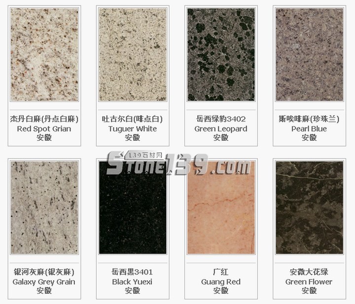 遼寧地區(qū):茶花綠G2125;丹東綠M2117;遼寧G2121;端青G2122;翡翠綠M2118;鳳城杜鵑紅G2101;建平黑G2102;青山白G2105;綏中白G2104;綏中淺紅G2106;綏中芝麻白G2103;銀點(diǎn)白麻G2120;銀河黑玉G2123;