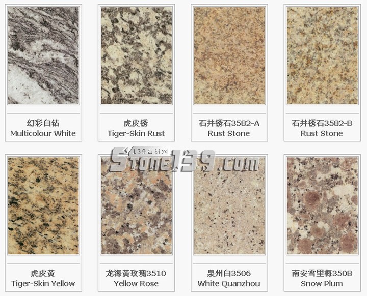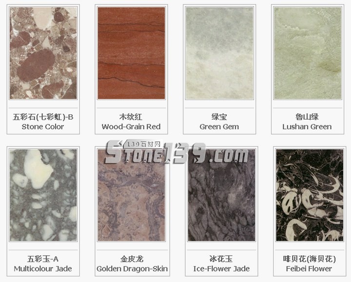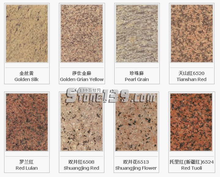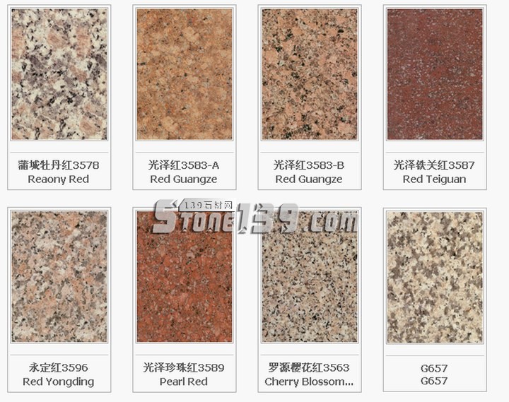 廣西地區(qū):岑溪紅G4562;楓葉紅G562;桂林紅G4572;桂林淺紅G4573;灰冰花M4505;輝綠巖G4577;浪花白G4575;綠波金龍M4502;湄海綠G4576;新啡網(wǎng)M4504;紫霞紅M4503;