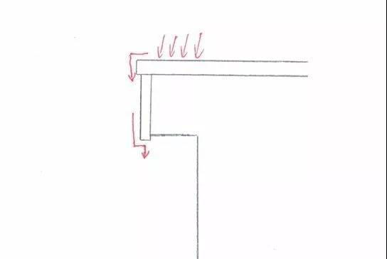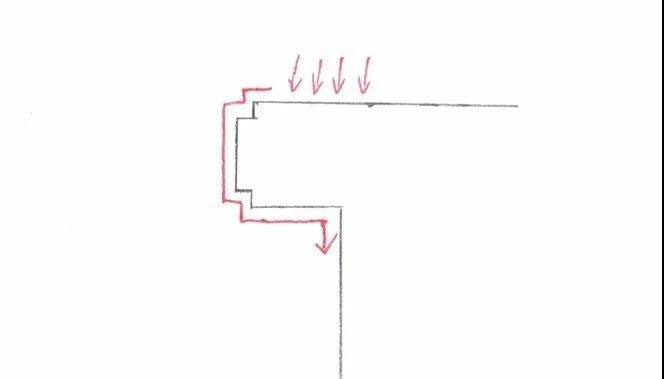 而正確的設計,是應當如下圖所示。這種水,可以使雨水在每一個拐角處滯留一部分,并且滴落一部分,停留在石材上的比例大幅減小,一個輕微的改動就可以大大改善石材使用中的水印效果。