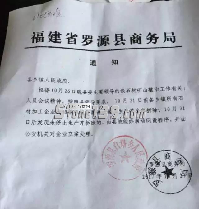 核心摘要:福建省羅源縣商務局通知各鄉鎮人民政府:根據10月26日晚縣委主要領導約談石材礦山整治工作有關人員會議精神,按照縣領導要求,10月31日前各鄉鎮所有石材加工企業大切鋸機機臺要停止加工生產并全部拆除;10月31日后發現未停止生產并拆除的,由縣能效辦啟動問責程序,并由公安機關對企業立案處理。羅源縣商務局2017年10月27日