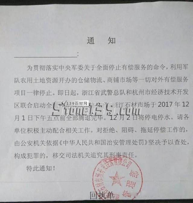 為貫徹落實中央軍委關于全面停止有償服務的命令,利用軍隊農(nóng)用土地資源開辦的倉儲物流、商鋪市場等一切對外有償服務項目一律停止。即日起,浙江省武警總隊和杭州市經(jīng)濟技術開發(fā)區(qū)聯(lián)合啟動全面停止有償服務工作。浙江石材市場于2017年12月1日下午五點前全部騰退完畢。12月2日將停電停水。請各單位積極主動配合相關工作。對拒絕、阻礙、拖延停償工作的,由公安機關依據(jù)《中華人民共和國治安管理處罰》堅決予以查處,構成犯罪的,移交司法機關追究其刑事責任。