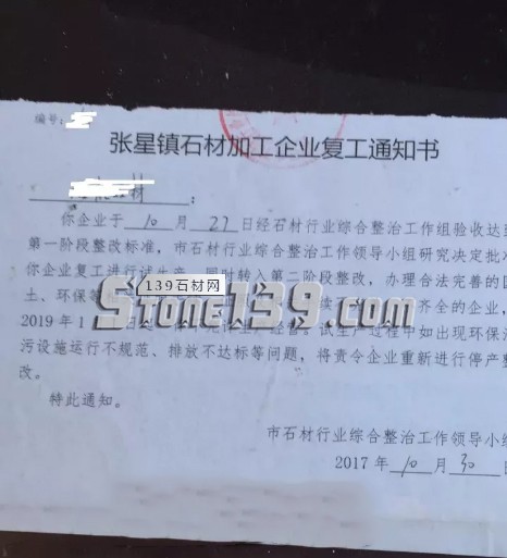 張星鎮(zhèn)石材加工企業(yè)復工通知書