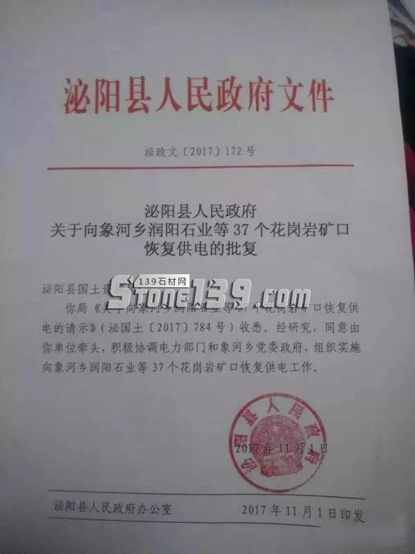 你局《關于向象河鄉潤陽石業等37個花崗巖礦口恢復供電的請示》(泌國土【2017】784號)收悉,經研究,同意由你單位牽頭,積極協調電力部門和象河鄉黨委政府、組織實施向象河鄉潤陽石業等37個花崗巖礦口恢復供電工作。