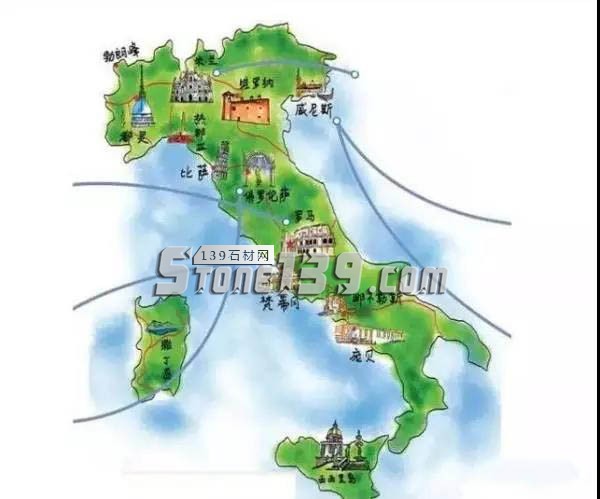 意大利石材資源極為豐富,生產礦點星羅棋布。特別是以卡拉拉為中心的西海岸和維羅納為中心的阿爾比斯山東段最為有名。前者主要產白灰色優質大理石;后者產深綠色、紅色和米色大理石。