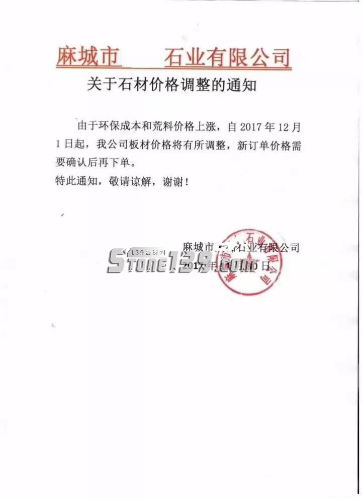 由于環(huán)保成本和荒料價格上漲,自2017年12月1日起,麻城石材板材價格將有所調(diào)整,新訂單價格需要確認后再下單。價格上漲3-5元每平方。