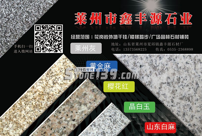 本廠坐落于北方石材基地山東萊州,是一家成立于2007年的朝氣蓬勃的年輕企業,主要從事花崗巖石材的加工企業,常年生產各種外墻干掛,室內鋪裝,樓梯踏步,廣場鋪裝,園林鋪裝等各種石材,主要產品有,山東白麻、芝麻白、黃金麻、櫻花紅(367、364)、晶白玉(355)、萊州青、萊州灰等各種異型石材、雕刻石材、路沿石、盲人道等。