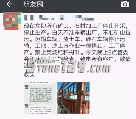 石材加工廠停止開采,停止生產(chǎn)。白天不準車輛出廠,不準礦山拉運。運輸車輛、渣土車、砂石車輛停止運輸……”