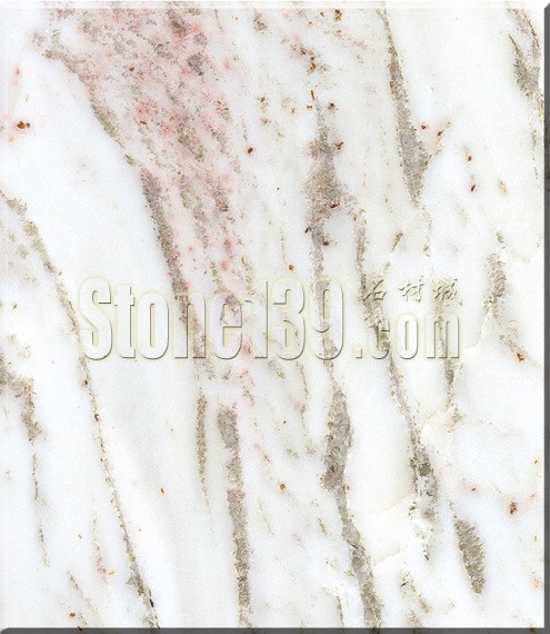新雅白大理石,白色底色,灰色和粉紅色的不規則線紋,粗細不均勻,另外還有暗紅色點狀