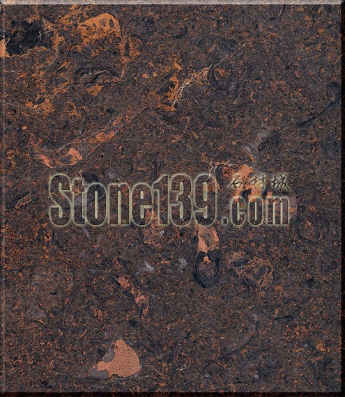 伊朗金花大理石,深棕色的底色,暗金色的花紋路,以及不規則的黑色馬蹄印形狀,深色進口中東大理石
