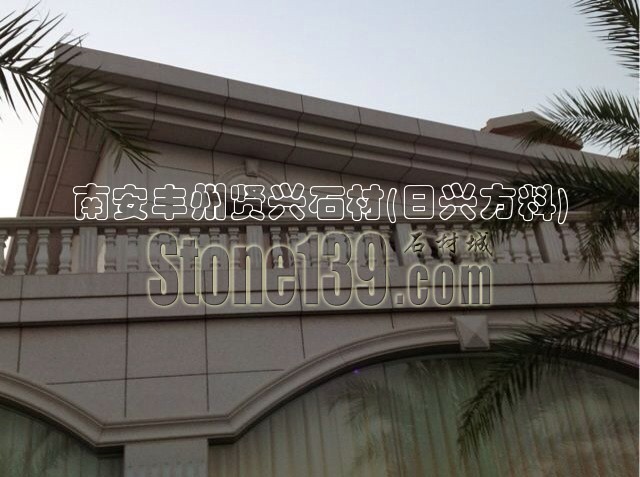 賢興石材別墅柱子欄桿工程案例實景圖,泉州白花崗巖石材別墅應用,主要裝飾有護欄欄桿,柱子,圓柱方柱,雕刻產品,異形線條裝飾,聯系電話:13805902573