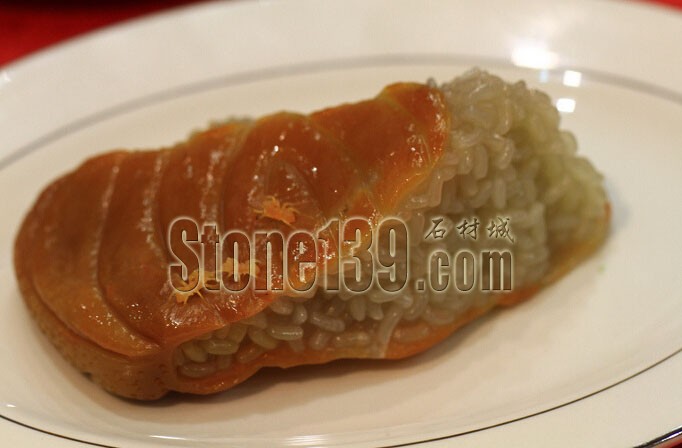 這么多的石材大餐是第一次見。作品中有我們經常食用的豬蹄、大骨頭、大蒜、包子、餃子、苦瓜、鴨爪、米飯、餅干、月餅、花生、雞翅、條子肉等,應有盡有色澤誘人,完全是一桌豐盛的石材滿漢全席。