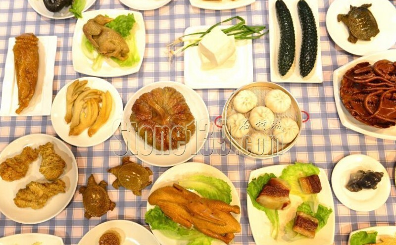 這么多的石材大餐是第一次見。作品中有我們經(jīng)常食用的豬蹄、大骨頭、大蒜、包子、餃子、苦瓜、鴨爪、米飯、餅干、月餅、花生、雞翅、條子肉等,應有盡有色澤誘人,完全是一桌豐盛的石材滿漢全席。