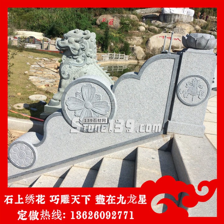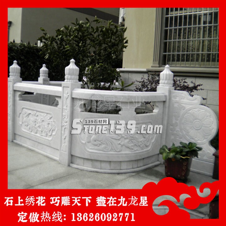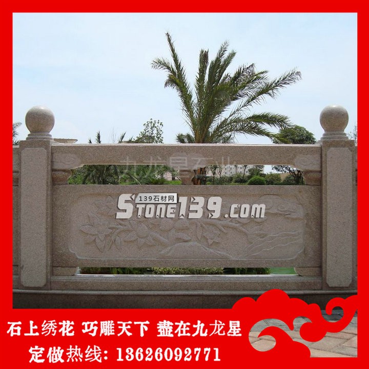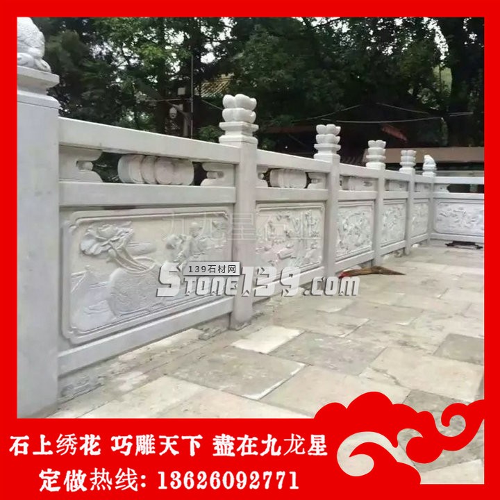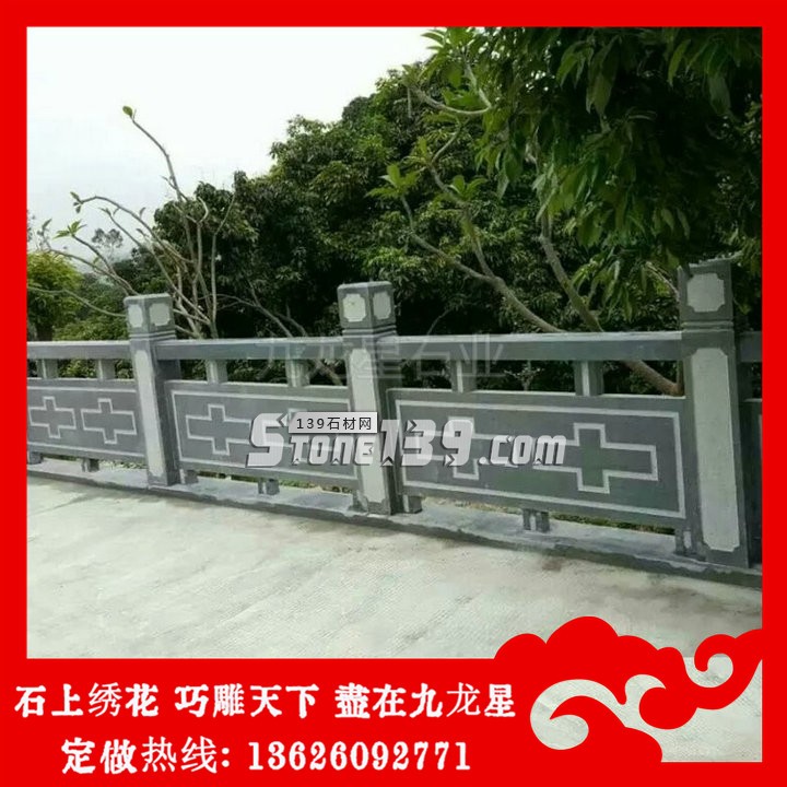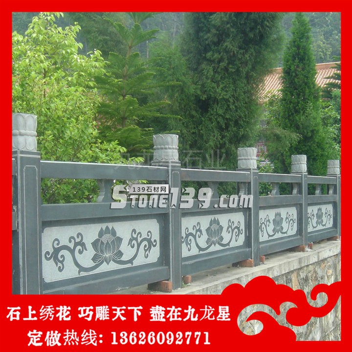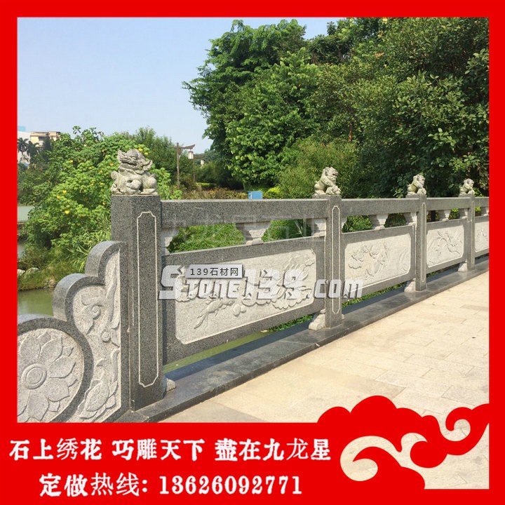 石雕欄桿欄板的花板可以雕刻有著大量的對美好事物的(比如花鳥蟲魚等等)或者傳統(tǒng)的(梅蘭竹菊等等)圖案,具有古樸美觀的造型,還具有傳統(tǒng)的審美意境。龍鳳呈祥圖、牡丹戲鳳圖、華封三祝圖、福壽三多;、錦上添花圖、蝙蝠題材圖,還有;鹿;魚;等動物圖案,寓意吉祥幸福的含義,大體上說村莊和景區(qū)橋面一般都雕刻吉祥花鳥等圖案。石雕欄桿多少錢一米?