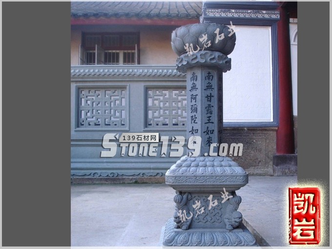 凱巖石業的石雕出食臺大多采用優質花崗巖(芝麻白、芝麻黑、青石等)為原材料,一般由柱礎、柱身、承露盤三個部分組成。最常見的石雕施食臺造型為底座是一塊四邊形的板,上面是一個單層的俯蓮臺,蓮花瓣會相對較大,通常這種蓮花瓣會做成雙瓣的,更飽滿許多。柱身部分則雕刻七寶如來大名以及本師釋迦牟尼的法名,一般規格高120CM至200CM不等,可根據需求定制,柱身一般為八角型,一面刻寺院名稱。