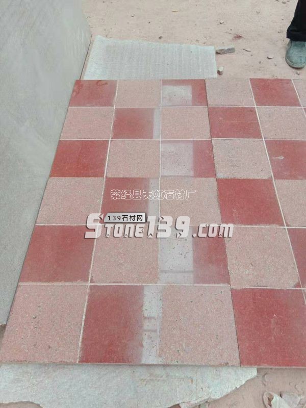 中國紅石材地鋪混搭 光面與粗面的方塊地鋪 荔枝面 火燒面 噴砂面等粗面