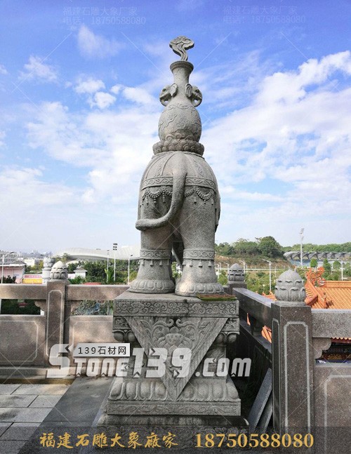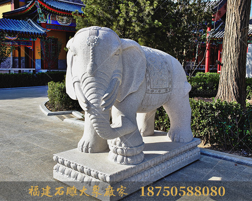 眼前的這尊石雕大象造型是寺廟石雕大象的常見款式“六牙白象”。《普賢觀經》所言:乘六牙白象王,若觀念慘悔,菩薩即乘六牙白象為其顯身。六牙代表六度,四足代表四如意,或謂,六牙表,六通。白象代表愿行殷深、辛勤不倦。六牙:代表六波羅蜜——布施、持戒、忍辱、精進、禪定、慧智。佛教稱六牙白象是菩薩所化,以表威靈,象征著愿行廣大、功德圓滿。因此六牙白象是普賢菩薩功德圓滿的象征。因此,“六牙白象”造型的石雕大象幾乎寺廟石雕大象的標志性特征。