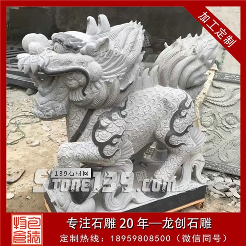 石頭麒麟是用優質青石、漢白玉、花崗巖、大理石等石材玉料雕刻而成的石雕麒麟。麒麟是古代的仁獸,集龍的頭、鹿角、獅眼、虎背、熊腰、蛇鱗、馬蹄、豬尾于一身,乃吉祥之寶,從古到今都是公堂上的裝飾,以振官威之用,也是權貴的象征。