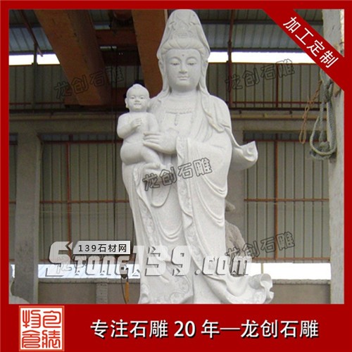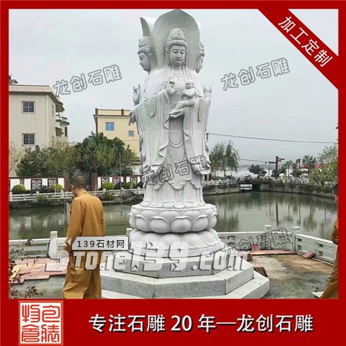 石雕站像的觀音通常是擺放在廣場(chǎng)或是在佛祖的旁邊,這種形象前面是以普度縱生的形態(tài)出現(xiàn),而后者是以學(xué)習(xí)佛法的學(xué)習(xí)者的姿態(tài)而存在,因此前者的表現(xiàn)是更為慈祥且隨和的,而后者的面部表情更像是在傾聽(tīng),專注,面部表情上會(huì)比較是嚴(yán)肅,但是虔誠(chéng)的一種表達(dá)。這一類形態(tài)的觀音大都是白衣飄飄的白衣觀音,手持凈瓶或抱著小孩的凈瓶觀音和送子觀音。