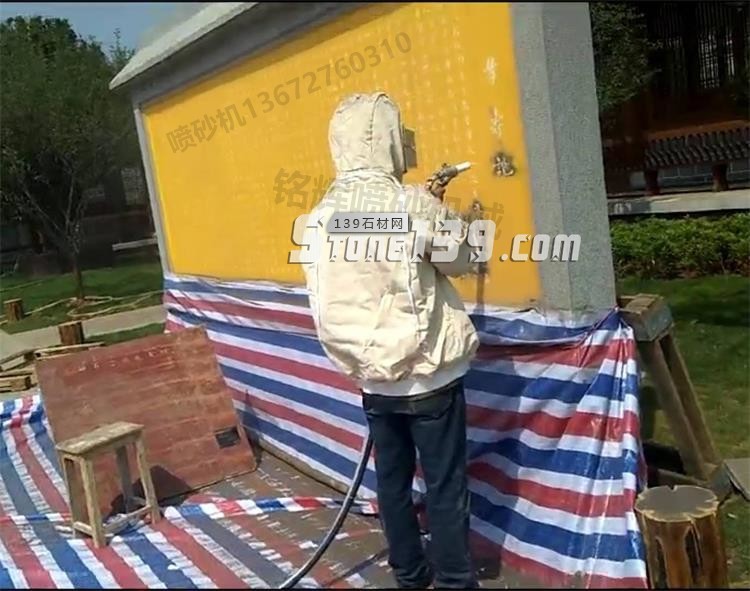 第三步:用噴砂機的噴砂槍對石材表面進行均勻噴砂即可(如上面視頻即可)