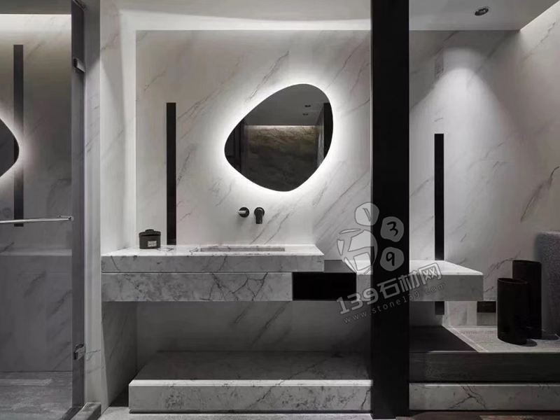 洗手臺/臺盆:將卡拉拉白大理石用于洗手臺或臺盆的臺面可以為衛浴空間增添一種豪華感。大理石的光澤和紋理可以與水龍頭、鏡子和其他衛浴配件相協調,為整個空間打造出一個高雅而精致的裝飾效果。