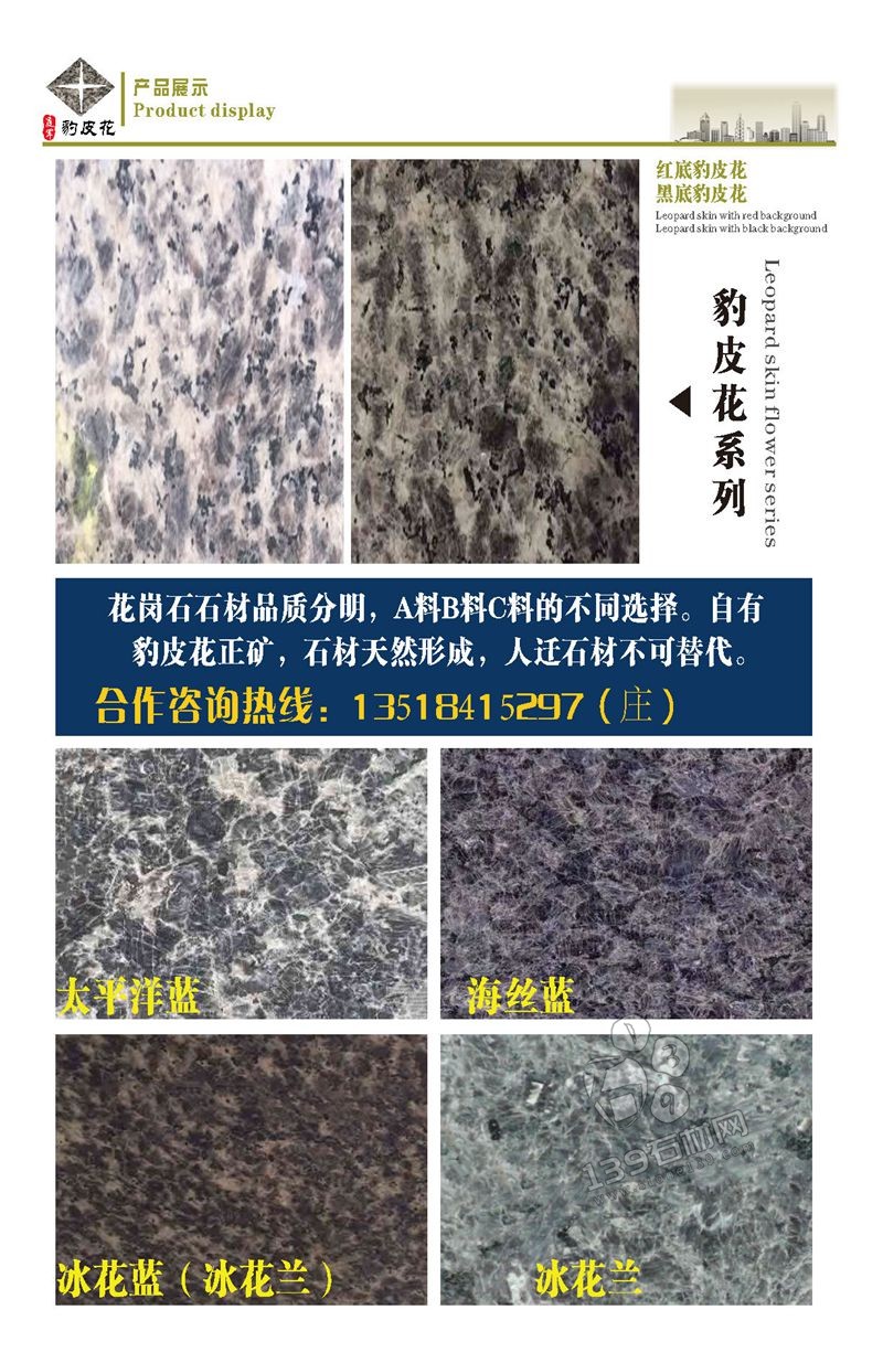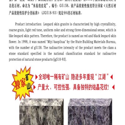 Product introduction: leopard skin granite is characterized by high crystallinitycoarse grain, light red tone, uniform color and strong three-dimensional sense, which islike leopard skin pattern. Therefore, the product is named as red and black leopard skinflower.In 1998, it was named "Miyi baopihua" by the State Building Materials Bureau.with the number of g5158. The radioactive intensity of the product meets the class astone standard specified in the national classification standard for radioactiveprotection of natural stone products (ig518-93).