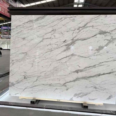 這塊白色大理石的紋路以灰色為主,線條自然流暢、靈動飄逸,深淺交織且分布隨性,似天然暈染而成;紋理走向無刻意規整的規律,細窄與寬幅的線條相互交織卻不顯雜亂,整體呈現出優雅且富有藝術感的天然肌理,給人清新又高級的視覺體驗。