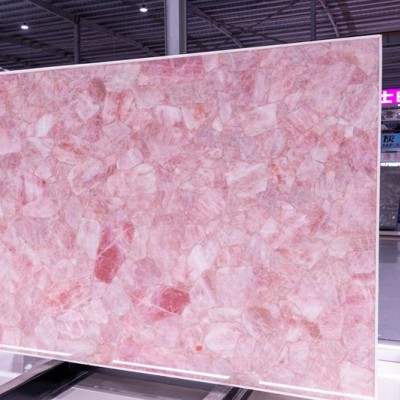 粉水晶奢石的板面呈現(xiàn)出大面積的粉晶質(zhì)感,整體以柔和的粉色系為主,色澤從淺粉到深粉漸變,如同將天然粉水晶晶體精心拼接而成,板面光澤度高,拋光后具有玻璃般的通透感,在光線照射下還能呈現(xiàn)出溫潤(rùn)的透光效果,質(zhì)感奢華且富有層次。 其紋路是由大小不一、形狀不規(guī)則的粉水晶晶體自然交織而成,晶體間的紋理如同天然的脈絡(luò),沒有固定的走向,呈現(xiàn)出隨性而又和諧的分布狀態(tài),部分區(qū)域還會(huì)夾雜著些許白色或淺粉色的晶體紋理,如同藝術(shù)大師的即興創(chuàng)作,每一塊板面的紋路都是獨(dú)一無(wú)二的,充滿了自然的藝術(shù)感。