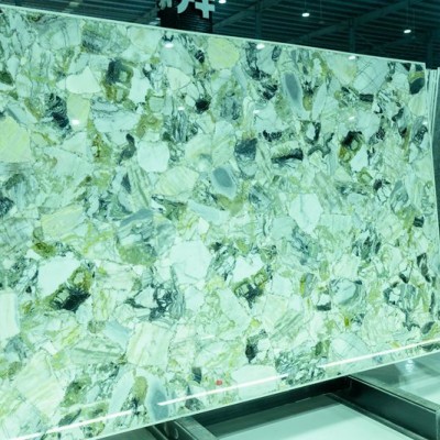 冷翡翠奢石的紋理極具自然藝術感:以深淺不一的綠色系為基底,融合了灰、白、黑等色彩,形成豐富的視覺層次。紋理由大小各異、形狀不規則的晶體碎片交織而成,這些晶體如同被精心拼接的翡翠碎塊,相互纏繞、交錯,呈現出隨性卻和諧的亂紋效果。其中,綠色的晶體或淺或深,淺綠如春日新葉,深綠似濃蔭翠色,還夾雜著黑色的紋理斑點,如同墨色在玉石上暈染,整體紋理無固定走向,每一處都像是天然的藝術創作,充滿了野性與奢華的質感,仿佛將一片翡翠森林的斑斕與深邃濃縮于石材之中。