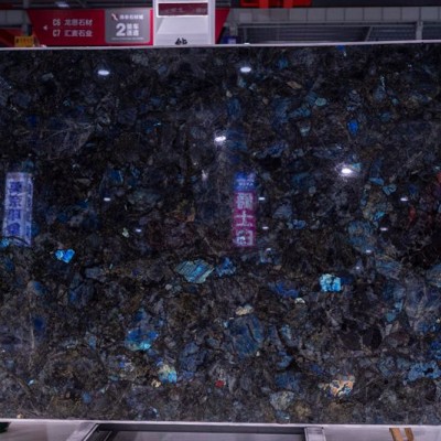 藍翡翠奢石大板的紋理極具震撼力:以深邃的黑色為基底,其上布滿大小不一、形狀不規則的藍綠色晶體碎片,這些晶體如同散落的寶石,相互交織、錯落分布,呈現出隨性卻極具藝術感的亂紋效果。晶體自帶虹彩效應,在光線照射下,會折射出從淺藍到深藍,甚至泛著紫調的斑斕光澤,仿佛將星空的深邃與寶石的璀璨濃縮于板面之上。黑色基底與藍綠色晶體的強烈對比,加之晶體的虹彩變化,讓紋理充滿了動態的奢華感,每一處細節都似天然的藝術創作,稀缺且極具視覺沖擊力。