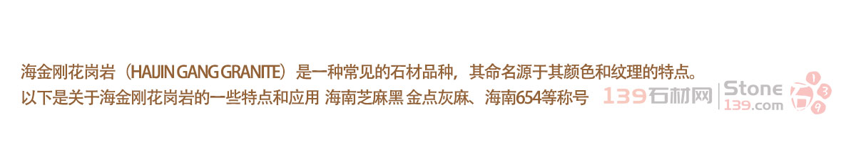 海金剛花崗巖(Haijin Gang Granite)是一種常見的石材品種,其命名源于其顏色和紋理的特點。以下是關于海金剛花崗巖的一些特點和應用 海南芝麻黑 金點灰麻、海南654等稱號