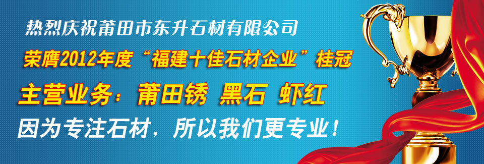 莆田市東升石材有限公司坐落于信譽海內外的海上和平女神媽祖的故鄉-福建省莆田市黃石鎮東山村。是一家集生產加工,工程設計,安裝施工,售后服務為一體的大型石材企業。是莆田乃至福建省規模較大的石材公司。莆田市東升石材有限公司擁有員工50余名,年生產16萬平方米以上各種規格的板材,采用全自動樹脂磨,產品光澤度達90度以上,獨資擁有花崗巖礦區,特別具備海量產能的611礦區,長期備有現貨,可生產大板,薄板,出口臺面板,磨光板,火燒板,剁斧石,路邊石,荔枝面,異形線條,圓柱,羅馬柱及石材木墻設計安裝,同時可承接大型工程.本公司產品長期出口到美國,韓國,中東等多個國家,獲得了廣泛的好評與贊譽! 公司奉行客戶至上,誠信為本的經營理念,以優質的服務服務廣大客戶!愿與廣大業內外朋友一起努力,共同打造海西石材企業第一品牌!樹立石材行業典范!竭誠歡迎海內外客商,用戶前來考察指導,洽談業務。 [詳細介紹] |